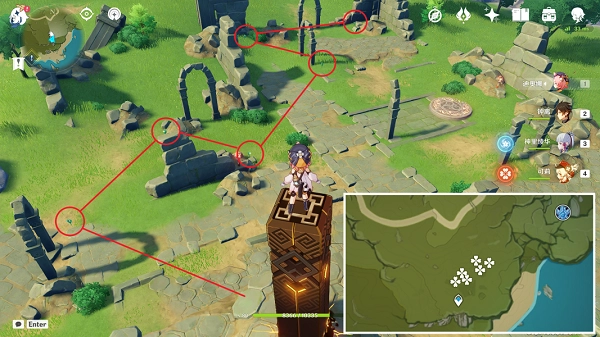 2、千风神殿周边区域,在这里能够采集到10株小灯草,从图中可以看出这些小灯草的分布位置较为偏僻,彼此之间距离也比较远,不太容易收集。
