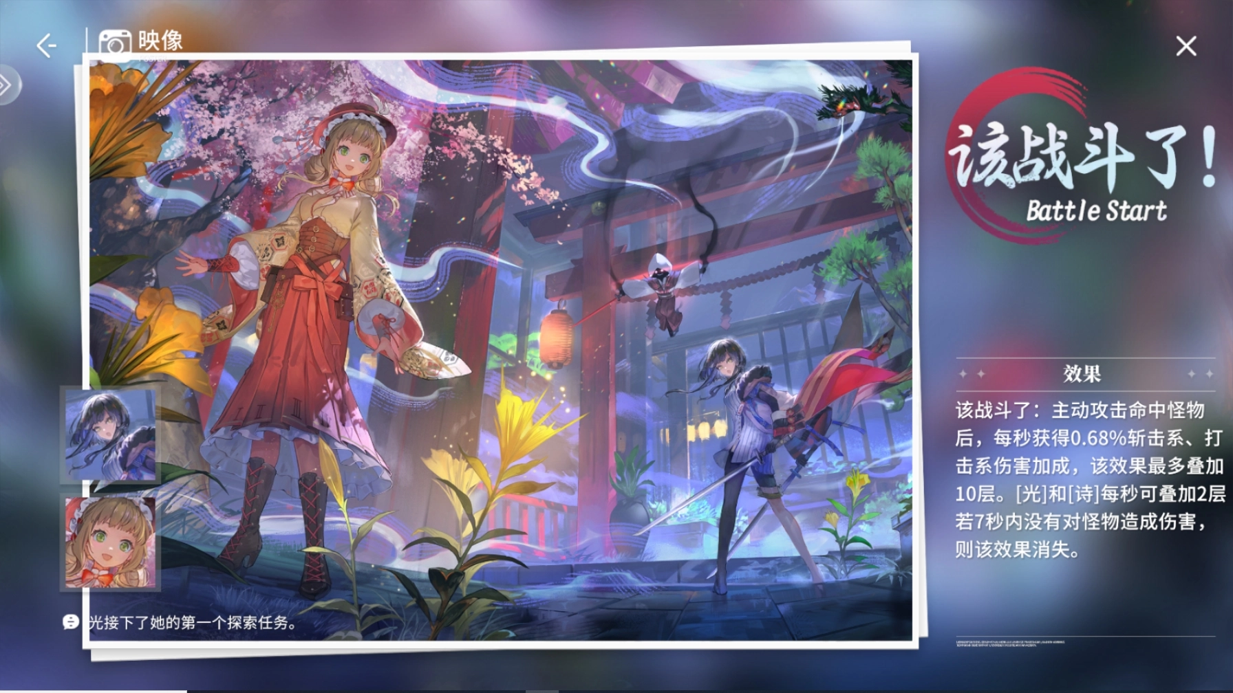 初级效果:主动攻击命中怪物后,每秒可获得0.68%的斩击系与打击系伤害加成,此效果最多能叠加10层。其中,[光]与[诗]属性的攻击每秒可叠加2层。若连续7秒未对怪物造成伤害,该效果将消失。