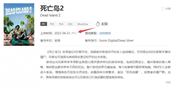 死亡岛2游戏的PC版本计划于2023年4月21日在Epic平台发售,现阶段该版本为Epic平台独占。