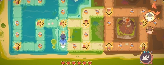 第三关有个小技巧:先往上走把上方的物品吃满,之后路线就随意多了,大家可以自己规划线路;确定没问题后,屏幕右上角会出现加速键。(水路需要注意的地方不多,建议先把水路上的物品吃完。)