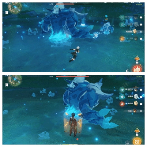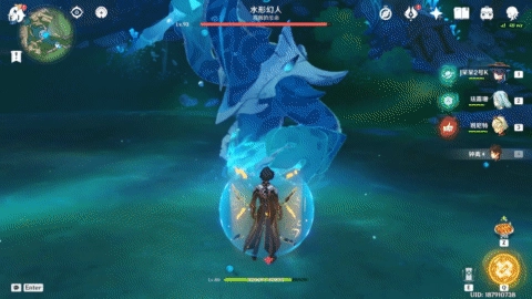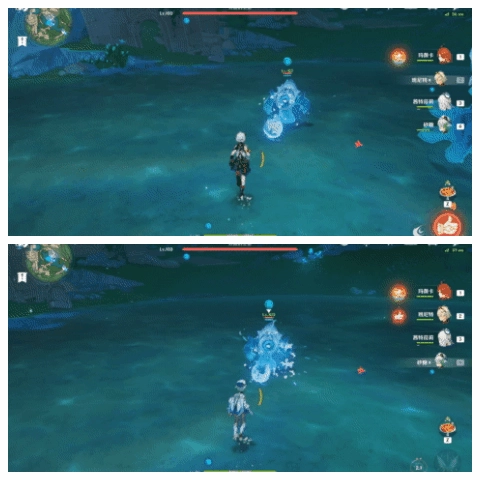 因此更推荐利用元素反应来应对——火、冰、风、岩、雷、草元素都能和水发生反应,而半幻人身上仅附着1单位水元素,所以当前只要用角色的火、冰、草、雷元素附着攻击,就能将其瞬间击溃。