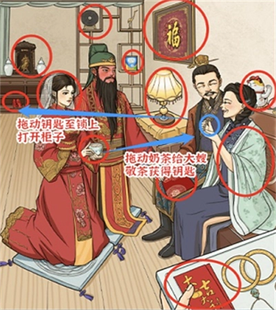 2、后方的桌子上摆放着【关公像】,架子上放着【黑胶唱片】与【奶粉】,女生头上戴着【头纱】,手里拿着【奶茶】,大嫂身着【旗袍】,把奶茶递给大嫂,就能得到【钥匙】,用钥匙打开后面的柜子,能找到【红色高跟鞋】,墙上贴着【福字】,下方有【台灯】,右下角有【红包】,图片右侧还有【招财猫】。