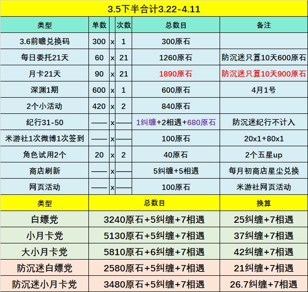 针对防沉迷玩家,考虑到他们的游玩时长和消费限制,本次统计未包含纪行(大月卡);已购买纪行的玩家可自行对照表格补充计算相关内容。