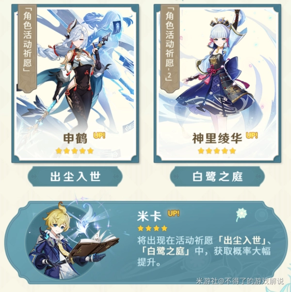 总结:如果想在这期卡池抽绫华,建议确保能凑齐一个“永冻队”;要是想抽申鹤,最好能抽到1命,0命申鹤搭配西风枪也能用,但这样的话不如直接抽雾切。另外,如果原石充足,再考虑抽申鹤或者补绫华的命座。个人觉得3.5版本的申鹤可以暂时不抽,绫华抽0命+0精武器、0命+1精武器或者2命+1精武器就足够了,毕竟3.6版本还在后面呢!