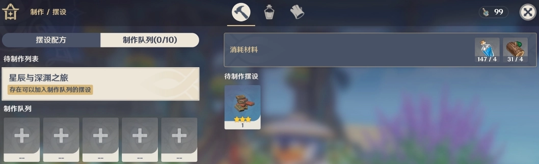 4、添加至待制作列表——退出建造模式并找到阿圆——进入摆设制作界面——打开制作队列——点击待制作列表
