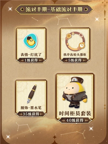 “时之回响季”派对季的派对手册包含基础版与高级版两个版本,二者对应的奖励存在差异。本季基础派对手册的所有奖励如下:800潮流纤维、17500瓶盖、稀有表情“打扰了”、高级头像框“秩序齿轮头像框”、稀有配饰“墨水笔”以及高级装扮“时间柜员套装”。