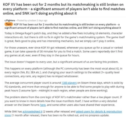 《拳皇15》发售后,玩家无论是在休闲模式还是排位模式排队匹配,往往都得等上30分钟才能进入比赛。部分玩家表示,即便排队数小时,也依然无法匹配到对手。尽管并非所有玩家都碰到了这个问题,但受影响的玩家数量确实不少。