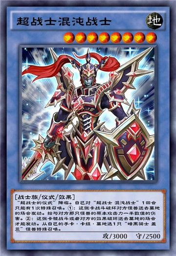 「超战士 混沌战士」是暗游戏经典卡片「混沌战士」的全新形态。当这张卡战斗破坏对方怪兽并将其送入墓地时,可给予对方相当于该怪兽原本攻击力一半数值的伤害。另外,若此卡因战斗或对方效果被破坏送入墓地,还能从手牌、卡组或墓地特殊召唤1只「暗黑骑士 盖亚」怪兽,借此在被破坏时依旧维持场面优势。