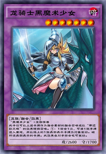 「龙骑士 黑魔术少女」是「黑魔术少女」和龙族怪兽融合后呈现的全新形态。每回合可以使用1次,将1张手牌送入墓地,就能破坏场上一张表侧表示的卡牌,而且这个效果在对方的回合也能发动,能在对方回合实现有效的打断效果。