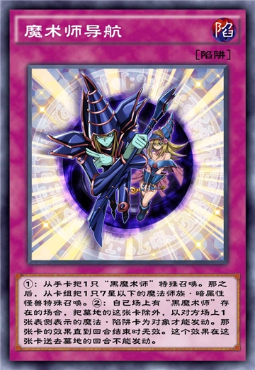 陷阱卡「魔术师导航」拥有从手牌把1只「黑魔术师」特殊召唤,再从卡组把1只等级7以下的魔法师族·暗属性怪兽特殊召唤的效果。
