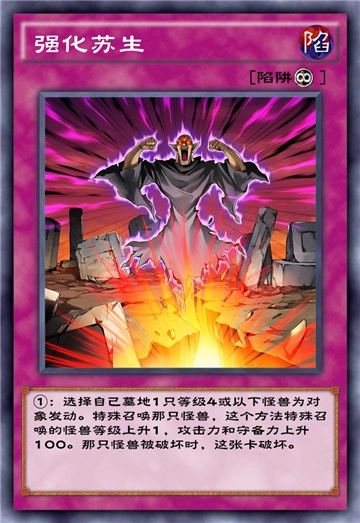 借助「强化苏生」的效果,就能从自己的墓地特殊召唤1只等级4以下的怪兽。而且这只怪兽的等级会提升1级,攻击力与守备力也会各增加100点。要是搭配那些在特殊召唤时能触发效果的怪兽,就能不断获取卡牌资源。