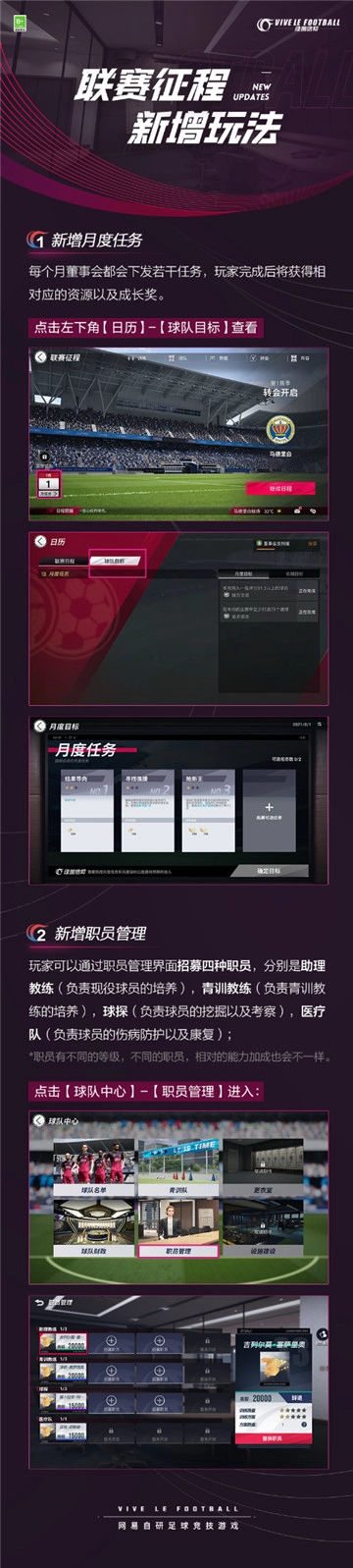 职员管理系统现已全新上线,经理们可通过球队中心的对应功能,为俱乐部招募四类职员:专注现役球员培养的助理教练、负责青训队伍建设的青训教练、专职挖掘与考察球员的球探,以及为球员提供专业护理的医疗队员。这些得力职员,将成为您征战联赛时最坚实的后勤保障!