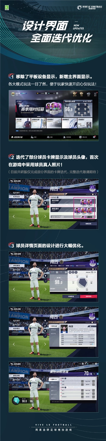 【绿茵共研服】本周对设计界面进行了更新。其一,将原来的平板设备显示替换为全新主界面,使各大模式玩法更直观清晰,方便大家快速找到并开启喜欢的玩法;其二,对部分球员卡牌显示和头像进行了迭代优化,采用球员真人照片,球迷们可以来看看自己喜爱的球星形象;其三,对球员详情页面的设计做了大幅调整,各项数值呈现得更加清晰简洁,还新增了球员履历板块,帮助大家回顾球星们的辉煌职业生涯!
