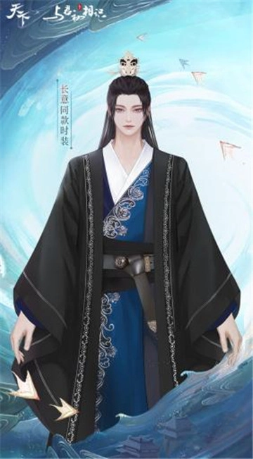 黑衣凝水魄,披发凛双眸。长意同款时装外罩一袭黑色长袍,边缘饰有银白云纹,尽显神秘肃穆之感。湖蓝色内衬的前襟,以银线勾勒出精致典雅的鲜花与波浪图案,搭配利落干练的黑皮腰带,雍容典雅的贵公子形象跃然眼前。