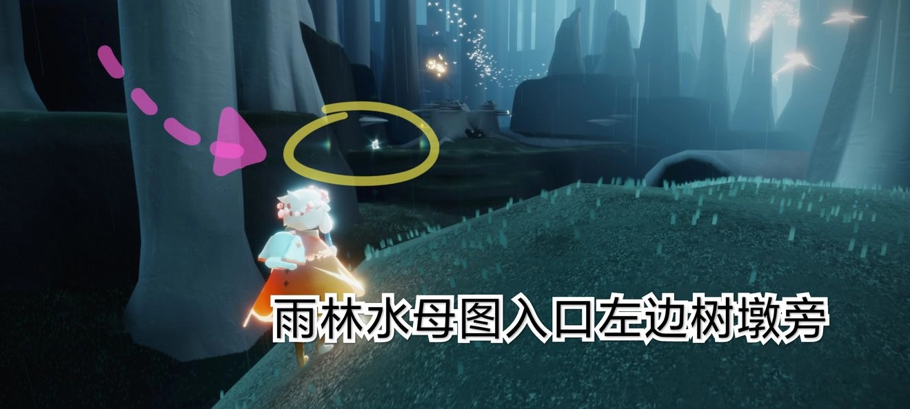 先祖在雨林水母图入口左侧的树墩旁边,点亮后跟随先祖并一起奔跑就能完成。