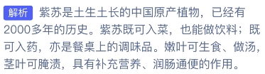 解析:紫苏是中国本土原生植物,有着2000多年的栽培历史。它用途广泛,既能作为食材入菜、制作饮品,又能入药,还可充当餐桌上的调味品。其嫩叶可直接生食或用于做汤,茎叶则能腌渍食用,并且具有补充营养、促进肠道蠕动以帮助通便的功效。