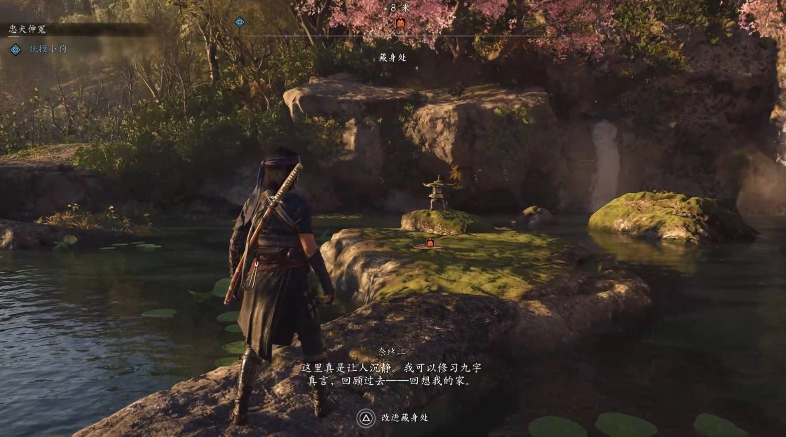 在藏身处东边的水池里,能找到一处九字真言的收集点。