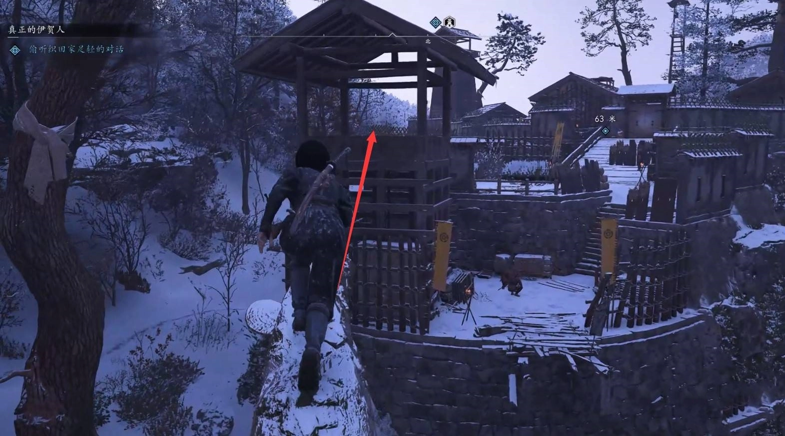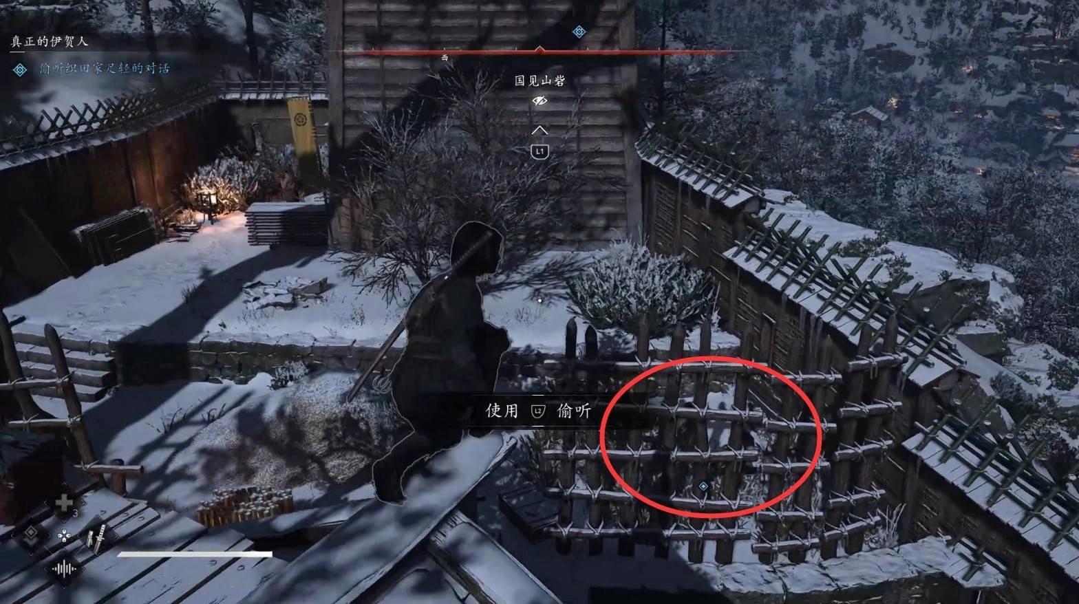 用钩锁进入营地后,爬到高处按下L2键,偷听“织田家足轻”的对话。