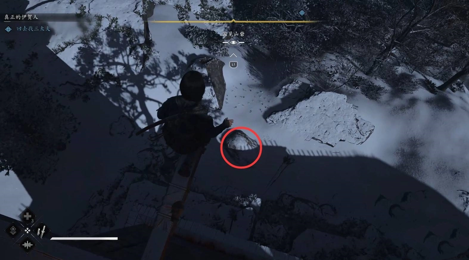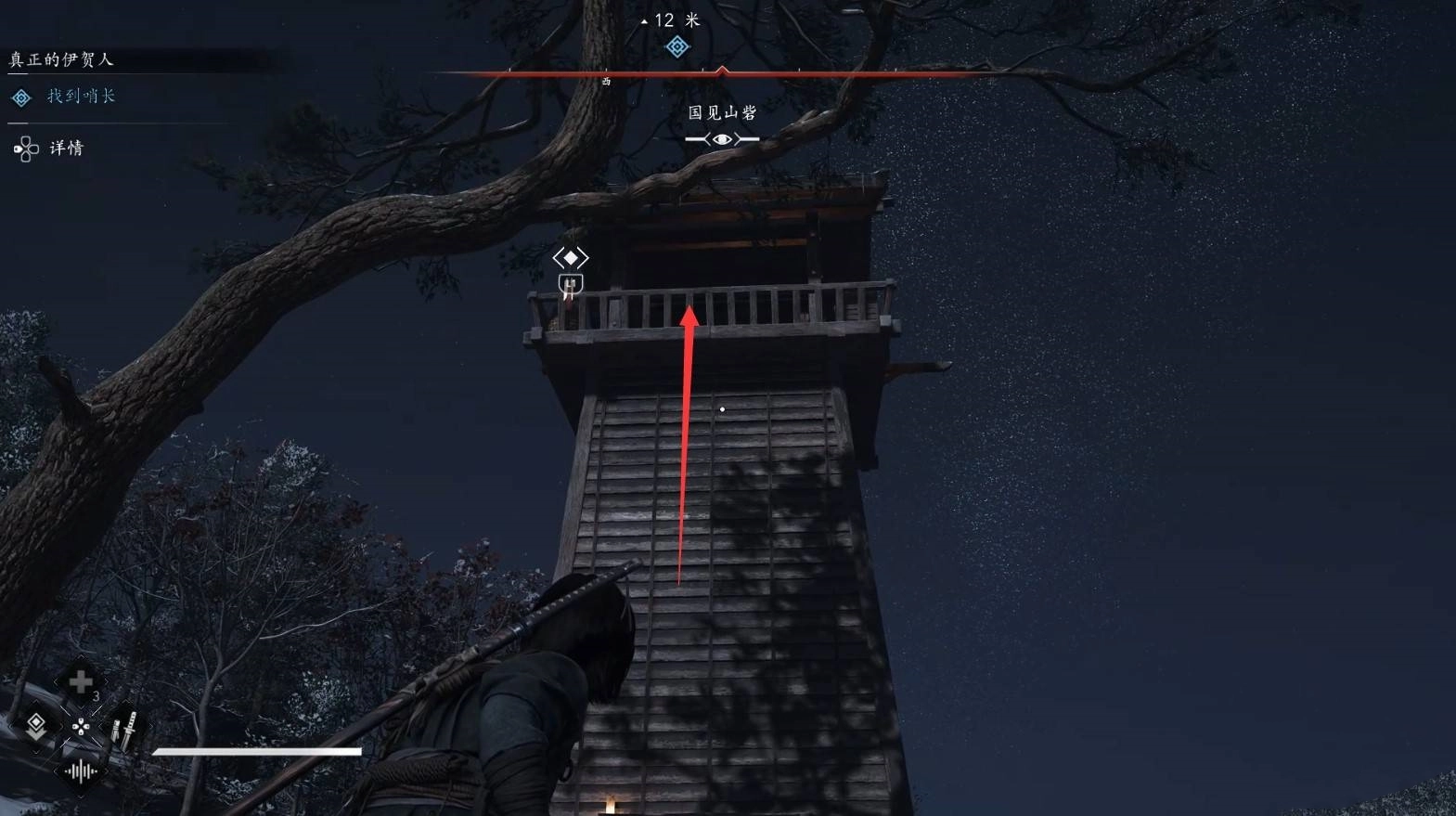 进入支线剧情后,先与NPC三太夫进行对话,随后爬上树枝,利用钩锁进入营地内部。