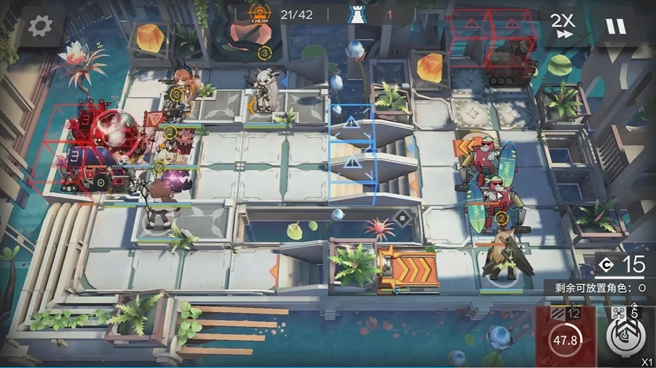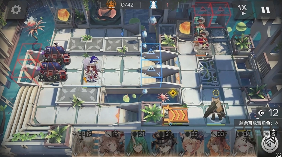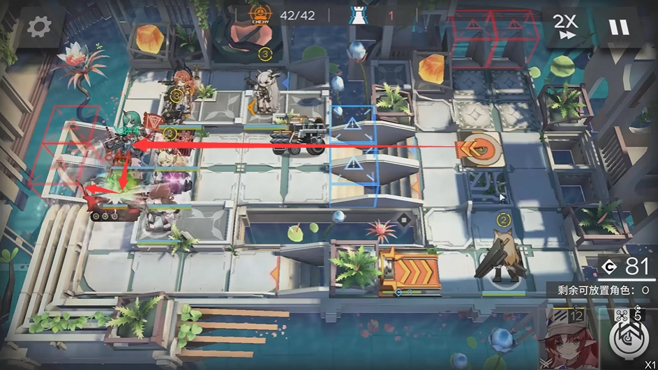 然后等费用足够后部署异客,将其放置在桃子上方左侧的高台上,方向朝下。右侧会有部分无法击败的敌人,交由客师父处理,异客需要开启模组。