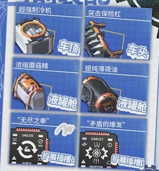 小车的配置包括:制冷机、保险杠、蘑菇精、薄荷油、无尽以及矛盾。