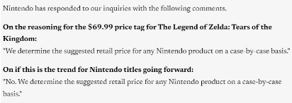 Gameinformer就《塞尔达传说:王国之泪》定价69.99美元的原因进行了询问,任天堂回应称:“我们会依据具体情况来确定任天堂旗下任何产品的建议零售价。”当被问及这是否会成为任天堂未来游戏定价的趋势时,任天堂再次表示:“不会,我们依旧会依据具体情况来确定任天堂旗下任何产品的建议零售价。”