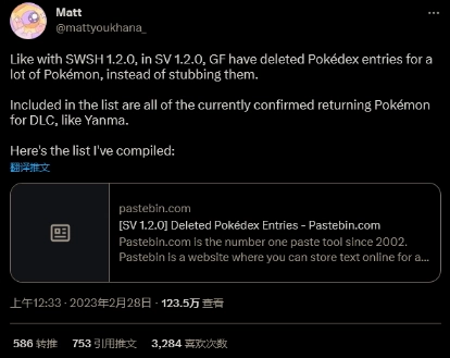 根据VGC的报道,数据挖掘者、推特用户mattyoukhana_透露,《宝可梦:朱/紫》的最新更新(版本1.2.0)移除了游戏当前尚未实装的宝可梦对应的隐藏图鉴条目。