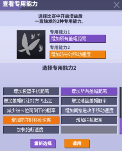 推荐理由:小盖帽是我觉得除了C之外所有职业都必须选的动作之一,不少普通角色玩家都有这样的困扰——比赛里一旦被骗跳就很难跟上节奏,而小盖帽恰好能弥补这个问题,让外线防守更有底气,非常值得推荐。