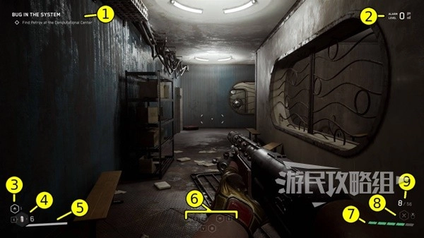 1. 当前目标:完成主线剧情必须达成的阶段性任务。2. 警戒等级:范围从0级到2级,数值越高意味着敌人的警觉程度越强。当警戒等级处于1级或2级时,场景内会不断出现新的敌人;只有在角色死亡,或者找到隐蔽处并等待足够长时间后,警戒等级才会恢复到0级。在探索地图的过程中,要留意敌人和摄像头的分布位置,尽可能避免被敌方察觉。