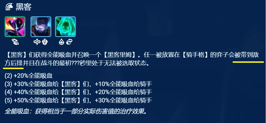 另一方面这套阵容对黑客体系有很好的应对能力,阵容中搭配了2个黑客羁绊,当遇到黑客体系的阵容时,薇恩可以直接飞到敌方后排,对敌方后排形成直接威胁。再加上装备科技枪刃带来的高攻击力和高续航效果,除非被连续控制,否则薇恩很难被击杀。