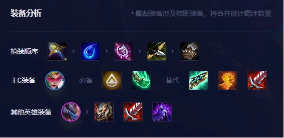 阵容主C薇恩,AI转职与朔极之矛必备,这是阵容核心装备。第三件建议科技枪刃,可给阵容大幅度增加续航能力,如果没有也可用正义之手,但需要阵容坦度装备较为优质。