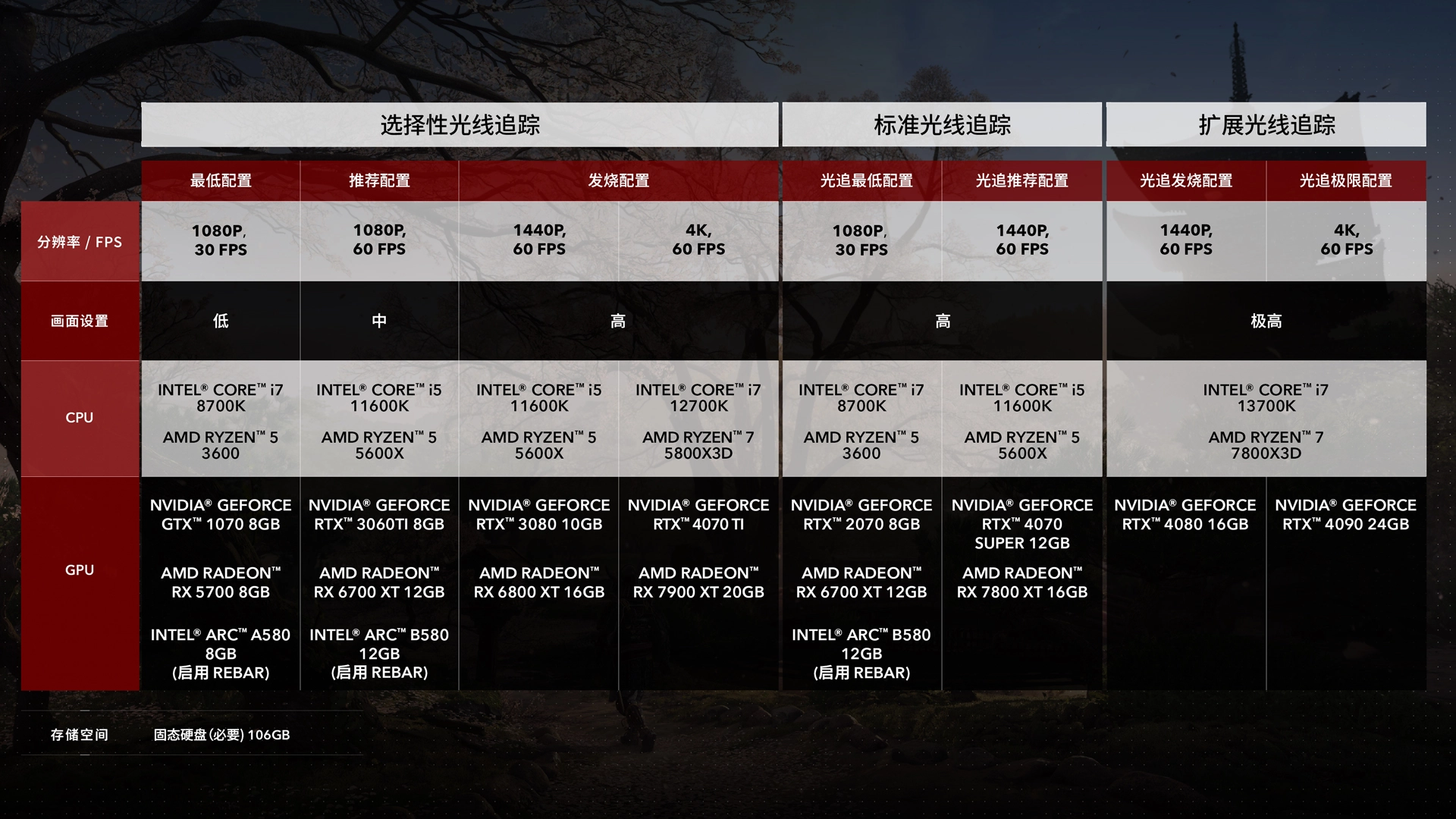 显卡配置要求为:Nvidia® GeForce RTX™ 3060Ti 8GB、AMD Radeon™ RX 6700 XT 12GB,或Intel® Arc™ B580 12GB(需开启REBAR功能)