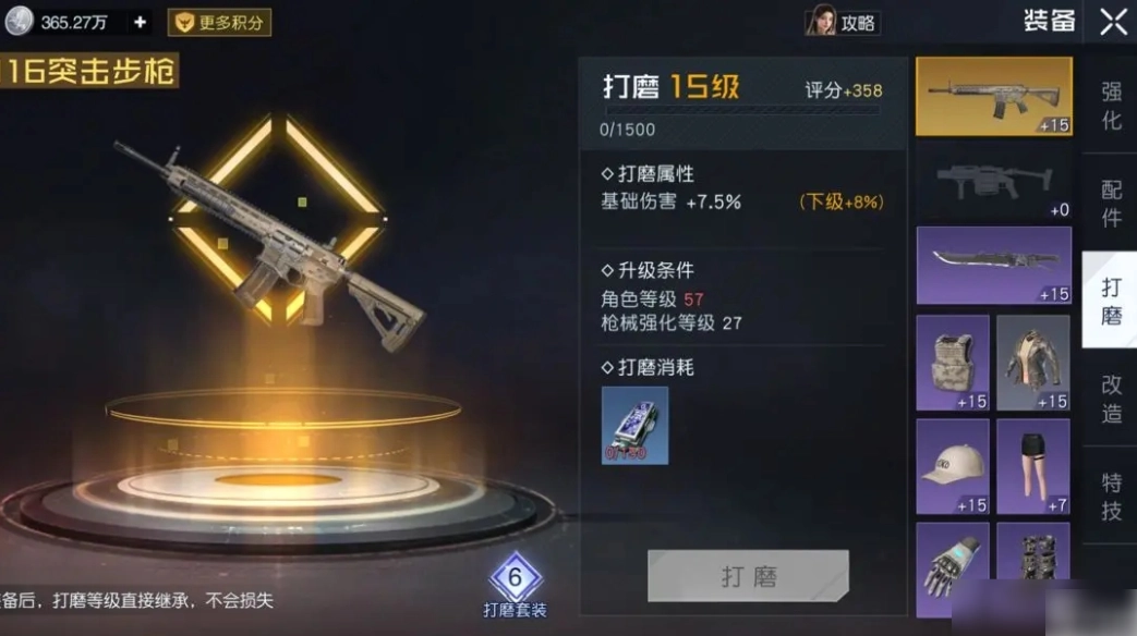 打磨系统和加强系统十分相似,不同之处在于加强提升的是基础数值,而打磨提升的是百分比数值。打磨需要使用一种叫“碳化硅结晶”的道具,该道具的获取方式与加强涂层相近,都可通过各类活动获得,当然也能在商城或商会购买,不过每天和每周都有数量限制。