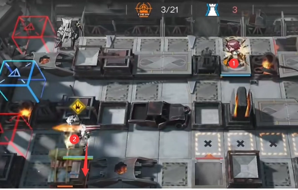 如图所示的开局部署顺序为:先放能天使(朝向左侧),接着部署山(朝向下方),等山把箱子击破后再开启技能。