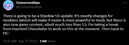 牧场经营类经典作品《星露谷物语》的官方开发者ConcernedApe在4月17日公布了即将推出的1.6版本更新的部分信息,其中重点包括对MOD的支持等内容,让我们一起来看看具体情况。