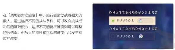 1、在「离垢者肃心旅宴」活动里,旅行者得击败实力强劲的敌人。挑选不同的战斗条件,能改变挑战胜利后的基础积分;选择不同的挑战难度,还能调整积分倍率,不过敌人的特性和挑战的难度也会随之产生相应变化...