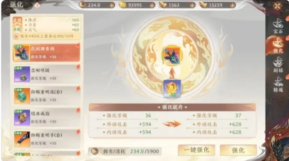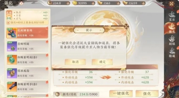 2、进行强化操作时,需依据强化等级消耗相应的强化精华与铜钱。