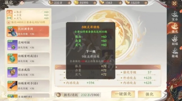 一键强化功能会按照从低到高的顺序依次强化各个装备,并且会循环进行强化操作,直到所有装备都达到当前的强化上限,或者不再满足强化所需的条件为止。