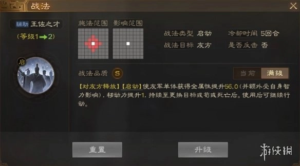 [对友方释放] [启动]使友军单体获得全属性提升56.0(该数值额外受自身智力影响),移动力提升1。效果持续至目标更换、目标撤退或目标死亡后。使用该技能后,释放者可继续行动。
