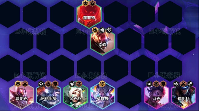 阵容组成:普朗克、墨菲特、李青、金克丝、阿利斯塔、莫甘娜、艾克、崔斯特