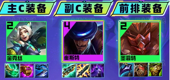阵容里莫甘娜沉底站后排,她的一技能能直接控住黑客体系,金克丝处理掉对面前排后,就很容易直接带走对面的黑客英雄。