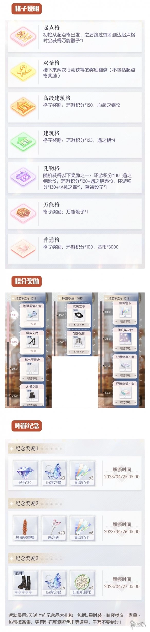 ⑤礼物格:内含四种随机奖励,具体为:环游积分110与遇之钥2、环游积分120与遇之钥3、环游积分130与心念之蝶1,以及普通骰子1。