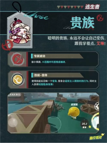 这位有着金色长发、身着血色长裙的女士,正迈着优雅的步伐缓步走来,她就是本次加入逃生者阵营的“贵族”。在对局里,“贵族”能凭借专属被动技能,在小范围内透视到追捕者的行踪。一旦危机临近,“贵族”便会释放专属技能“替身”:召唤出一个会延续主人释放技能时动作的替身,与此同时,主人还会获得短暂的隐身效果。