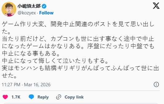 “看到那篇吐槽游戏开发艰难的帖子,我特别有共鸣。”他写道,“这话讲出来或许没人相信,但卡普空确实有不少游戏在开发过程中就夭折了。有的项目刚启动就黄了,有的都做到一半被砍掉。那时候,我有时候气得都想掉眼泪。我们当年是拼尽全力,才让《怪物猎人》得以问世。”