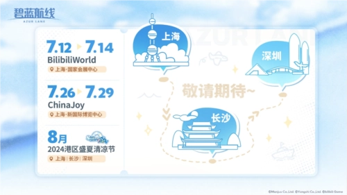 盛夏之约的惊喜远不止于此,在2024ChinaJoy落幕之后,8月《碧蓝航线》将首次举办“2024港区盛夏清凉节”活动。这场活动将覆盖上海、长沙、深圳三座城市,为各地玩家呈现一场融合游戏互动、现场演出与精致周边的大型主题展会。让我们一同期待《碧蓝航线》在后续活动中为玩家带来更多惊喜,见证它在夏日的热烈氛围中焕发出独特的魅力。
