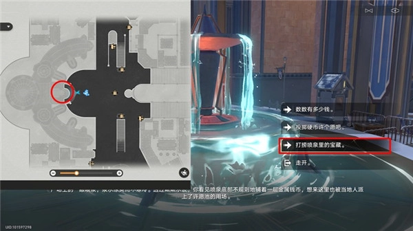 和喷泉进行互动,挑选打捞喷泉中宝藏的选项。