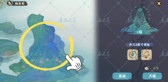 1、用水云石升级仙女石,每次升级都能获得奖励,仙女石每提升一级,就能解锁更多机制;