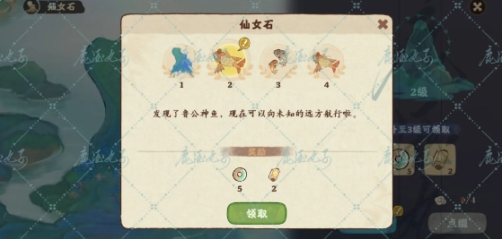 仙女石达到3级时,将解锁仙女湖的钓鱼点,同时奇货的价值会得到提升,鲁公神鱼的货舱层数也会增加3层。
