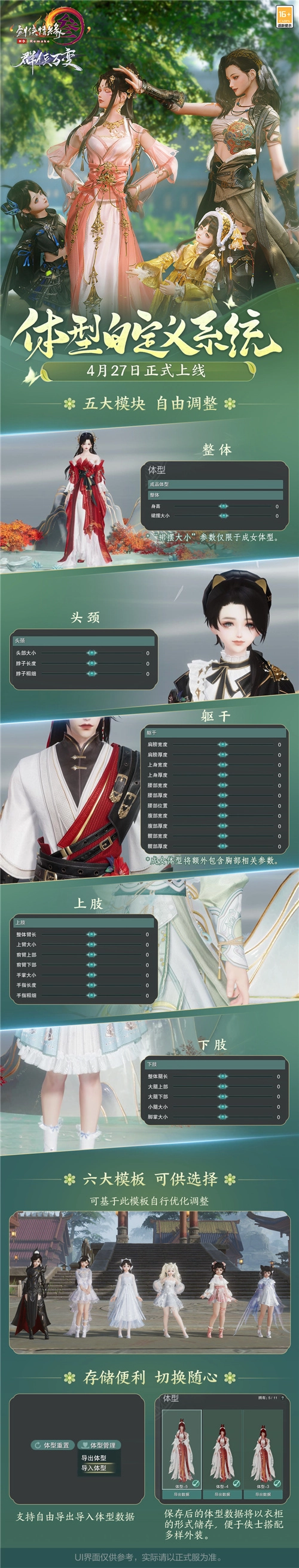 自由定制释放创意,畅享公测惊喜福利,体型自定义系统今日震撼登场!全民免费赠送3次体型自定义机会,前所未有的多元江湖,就此开启!五大模块随心调整,操作简单一键保存,更低的上手门槛,更高的调整自由度,快来打造你最理想的形象吧!