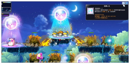 专题上线后到4月5日期间,点击左侧星星位置接取[冒险岛互动播]冒险岛直播-炫舞人生任务,消灭等级对应的500个怪物,就会有花蘑菇、伽马欧米伽、休彼德啦和超级巨星品克缤这些特别客人登场,开启炫舞人生时刻!他们会跟着镜面球一起跳舞,每当镜面球绽放璀璨光芒时,就能获取丰厚的经验值,而且镜面球周围的怪物还会受到攻击!*每天最多可参与10次炫舞人生活动。